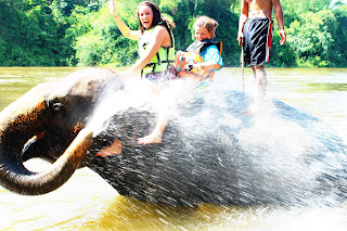 After the jungle trekking came the part we were most excited about....bathing elephants. While everyone else in our group was led off to try bamboo rafting Kayla and I hopped on another elephant and took off down to the river. We tried to explain that we were both good swimmers and that we didn't need a life jacket in water that barely went past Kayla's waist (we didn't point out that I couldn't touch in some points.) We figured that since they just let us ride on the elephants neck when we weren't supposed to that they wouldn't have an issue with us taking off the jackets. Wrong, "Safety first!" they said. We couldn't really brood over the jackets because as soon as the elephant was all the way in the water she started blasting us with water. We thought that she would spray a little water and that it would be like it was raining. Instead, she spit (sneezed, blew, whatever) the water out of her trunk at like a million miles an hour. It hit Kayla like a ton of bricks. Good thing I had my "big" sister there to take the first flew blows! After a few goes the elephant sunk down in the water and then shook us back and forth as hard as she could so that we would fly off her back. Then we took turns climbing up her back and getting doused. It was so much fun. This was definitely an experience that we could not have had back home in the states. Call us irresponsible, tell us to grow up, whatever you want but this was a once in a lifetime experience that we wouldn't trade for any desk job in the world.