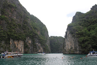 One of the things Kayla & I were most excited to do in Phuket was to go snorkeling around the island of Koh Phi Phi (pronounced pee pee.) On the trip you have the opportunity to not only snorkel at several different locations but you also have the chance to visit several spectacular sights. There are the limestone cliffs, Viking Cave, Monkey Beach, and 2 very nice beaches where you can eat and relax. We were beyond excited to see so many of the sights that we had been looking at in photographs for months. The limestone cliffs seem incredibly tall as you sail along below them and Viking Cave looks like something that could be in a horror movie. Monkey Beach was cool because as your boat pulls up to the beach tons of monkeys swarm into the trees above waiting for you to throw fruit to them. They do warn you to be very careful as the monkeys have been known to jump down into the boat and try to follow you home. Both of the beaches we visited were very nice. One of them was featured in the movie "The Beach" starring Leonardo DiCaprio. Kayla and I had seen the movie in our hotel on Koh Tao. Unfortunately, the movie does not make you want to go off and explore the area on your own. We also had the chance to visit a spectacular cove while on the trip. Let's just say that it puts the party cove on Canyon Lake to shame. Overall it was a great day. We had the chance to see some amazing sights, swim with all kinds of fish, and see some of the biggest, pinkest jelly fish we have ever seen!